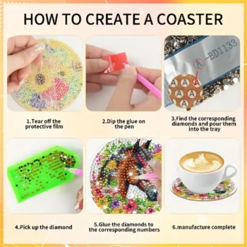 【DIY Coasters】The Diamond Painting Kit has all the tools needed to make it easy for you to finish the piece. First rip the protective film of the coaster, then find the corresponding diamond dots according to the printed numbers or letters, and embellish them, and finally put the cork pad on the coaster, and you are finished.